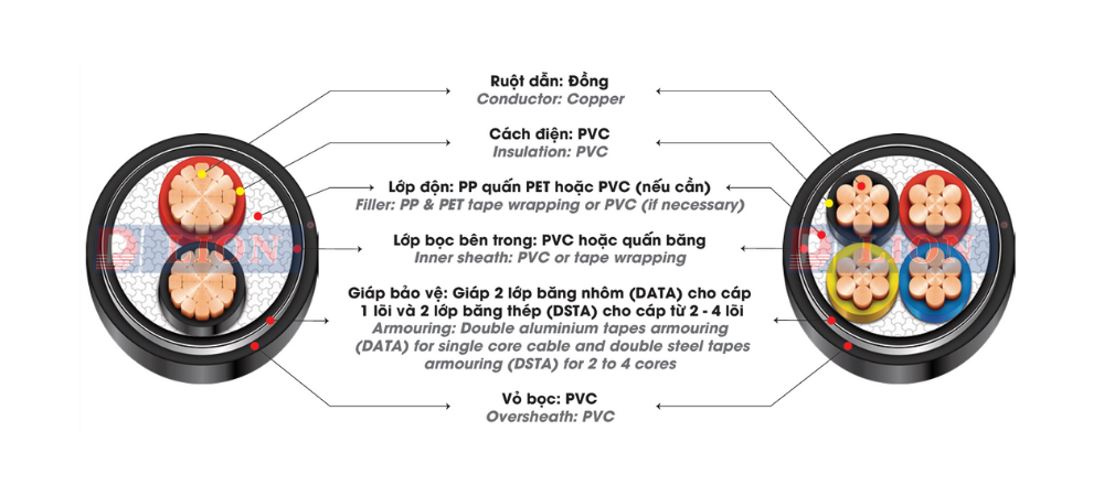 • Cáp điện lực, ruột đồng (Cấp 2), băng kim loại (DATA hoặc DSTA), cách điện PVC, vỏ PVC bảo vệ.