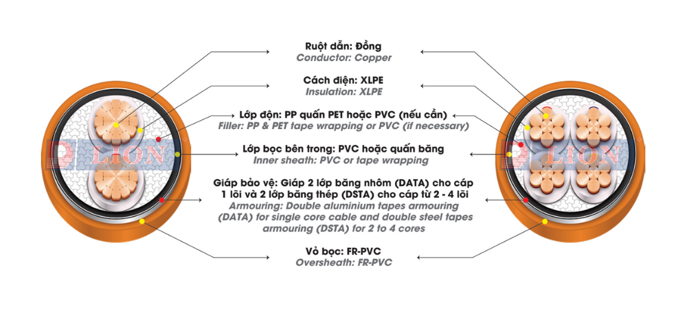- Cáp chậm cháy, ruột đồng (Cấp 2), giáp băng kim loại (DATA hoặc DSTA), cách điện XLPE, vỏ bảo vệ FR-PVC.