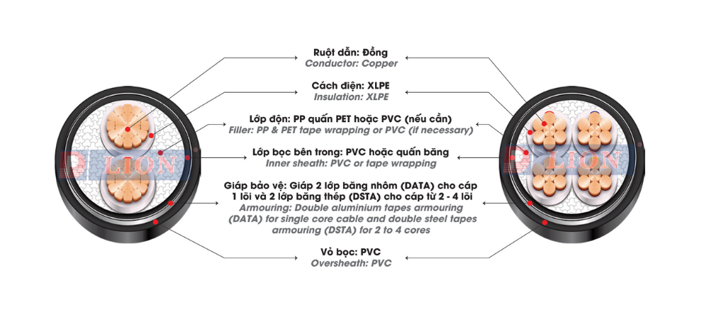 • Cáp điện lực, ruột đồng (Cấp 2), băng kim loại (DATA hoặc DSTA), cách điện XLPE, vỏ PVC bảo vệ.