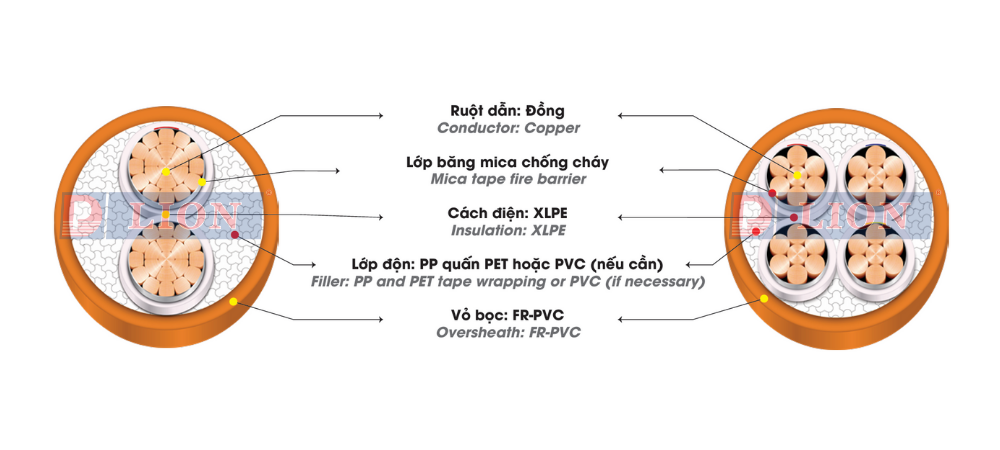• Cáp chống cháy, ruột đồng (cấp 2), giáp băng mica chống cháy, cách điện XLPE, vỏ bảo vệ FR-PVC.