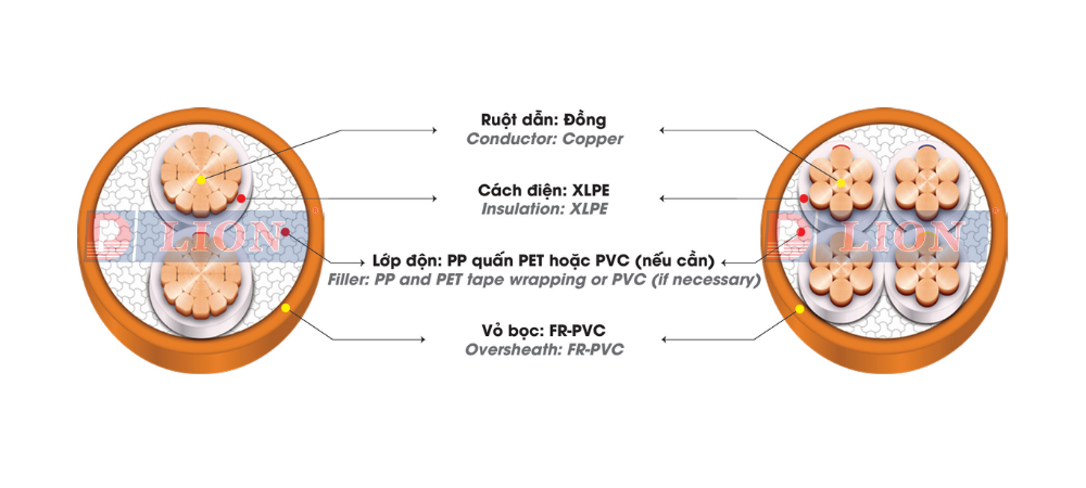 • Cáp chậm cháy, ruột đồng (Cấp 2), cách điện XLPE, vỏ bảo vệ FR-PVC.